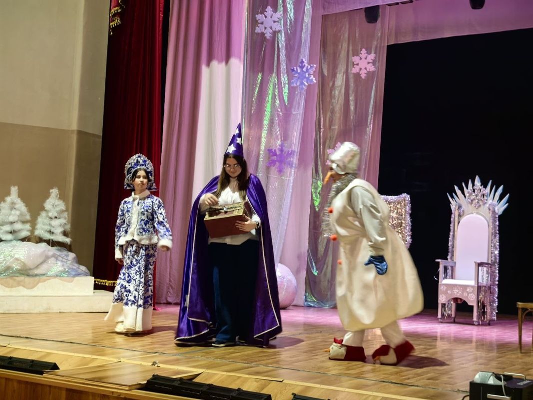 Ребят встретили традиционные герои русских новогодних сказок: Снеговик, Звездочёт, Баба Яга, Дед Мороз и Снегурочка, с которыми они и оправились в увлекательное праздничное путешествие в поисках новогодних чудес.