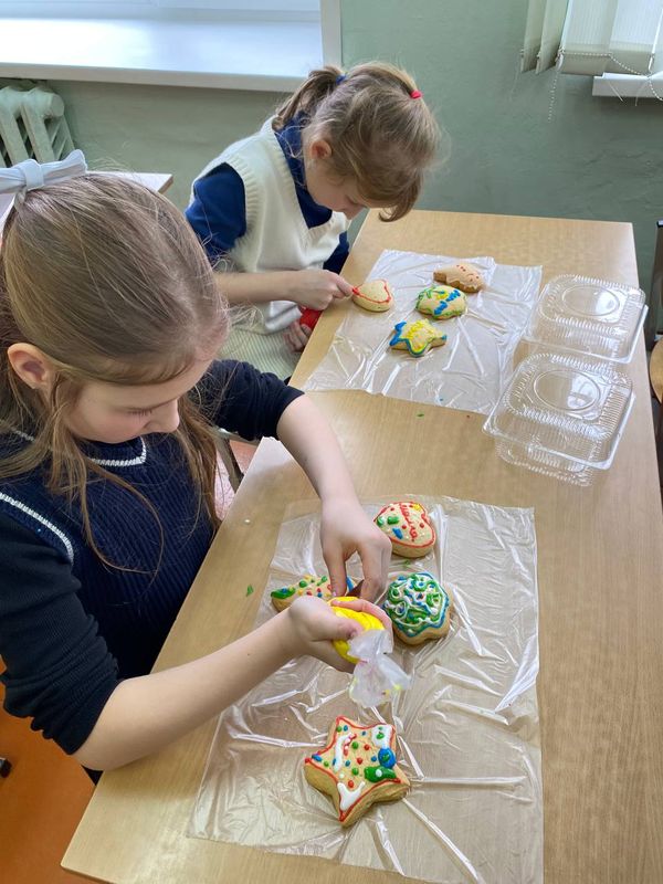 Ребята с воодушевлением разукрашивали ароматные имбирные пряники глазурью, посыпками и добрыми пожеланиями. Кто-то создавал снежинки, кто-то — сердечки, а кто-то — целые зимние пейзажи!