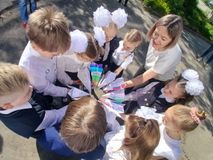 Во время торжественной линейки первоклассники выступили перед выпускниками со словами благодарности и подарили им самолётики будущего «Навигаторы Детства».